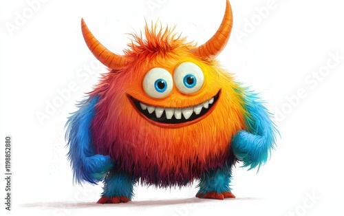 Friendly colorful monster with small horns and a big smile, isolated on a white surface
