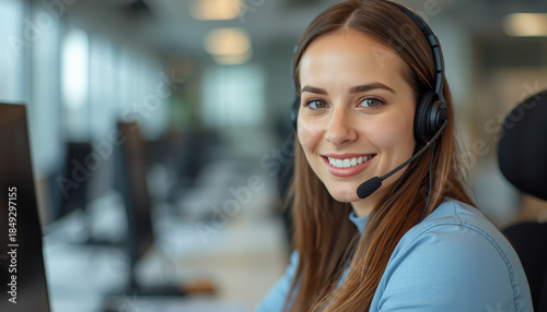 Friendly customer service representative smiling with headset in modern office