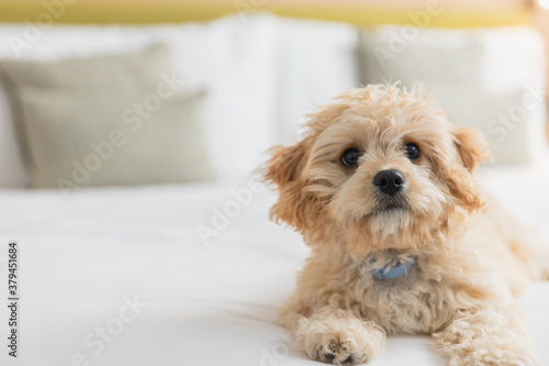 Friendly dog is playing on the bed in hotel room