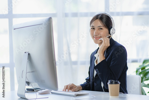 Friendly female call operator with headphones using a call center office computer. consulting concept