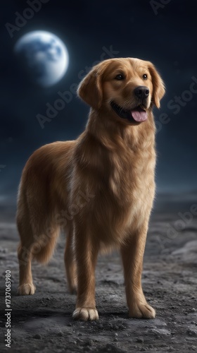 gold, retriever, dog, friendly, standing, moon, lunar, surface, grey, dust, lightly, dusted, fur, animal, paw, crater, rim, pebble, rock, earth, planet, blue, white, sphere, horizon, up high, rising, space, cosmos, astronomy, outer, earth, scene, joyful, happy, expression, smile, tail, realistic, photorealistic, style, art, artist, creative, imaginative, conceptual