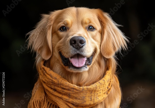 dog, golden retriever, pet, animal, warm, cosy, foulard, smile, friendly, nature, fur, happy, expression, portrait, closeup, companion, playful, calm, adorable, bright, stylish, cheerful, winter, domestic, furry, loyal, canino, companionship, cuteness, gold, love, warmth, emotion, happiness, joy, relaxed, visual, comfort, calmness, fluffy, cute, personality, photogenic, character, posing, snout, feature