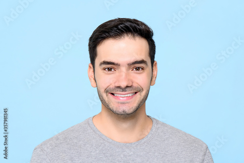Friendly handsome smiling Caucasian man isolated light blue background