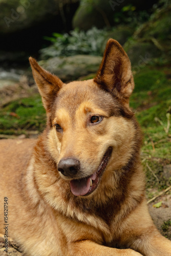 companion, loyal, friendly, happy, tan, mixed breed, mutt, nature, rural, farm, village, town, countryside, natural background, green, earthy, rock, attentive, relaxed, contented, alert, panting, muzzle, fur, hair, closeup, head shot, domesticated, animal welfare, south america, colombia, authenticity, local, rustic, natural light, daylight