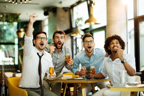 Friends are happy while watching game at te ub and drinking beer.
