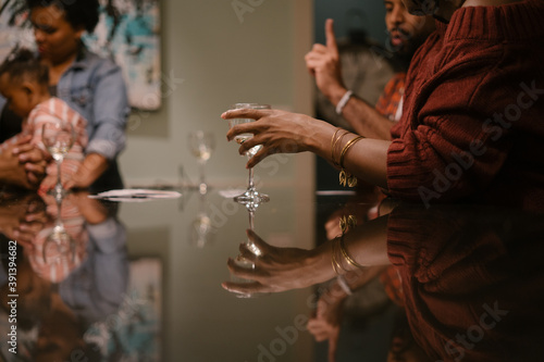 friends, drinking, wine, playing, card, game, 30s, adult, african american, black, diversity, female, gathering, isolated, male, man, mid, pandemic, party, people, safe, together, woman