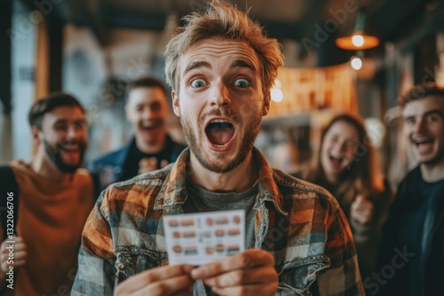 friends, excitement, cafes, joy, evening, game, ticket, celebration, laughter, group, happiness, anticipation, cosy, young, adult, fun, camaraderie, expression, atmosphere, gathering, socialising, enjoyment, moment, thrill, cheer, smile, people, team, ticket, reveal, cheerful, close, engagement, weekend, bonding, memorable, warmth, good, time, adventure, lively, event, shared, experience, generative, ai