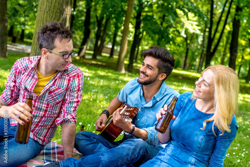 Friends in park enjoying time together, playing guitar and drinking beer
