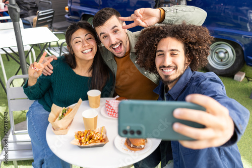 friends, meal, selfie, smartphone, gathering, fast food, smile, happy, casual attire, man, woman, lunch, snack, diverse, group, young adult, camaraderie, togetherness, leisure, mobile phone, camera, epicure, urban, lunchtime, break, laughter, trend, take-away, convenience, technology, youth, burger, fries, drink, daytime, fun, table, chair, cheerful, sociable, enjoyment