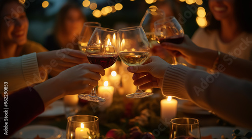 friends, toasting, wine glass, christmas, festive, cosy, celebration, candlelight, christmas tree, winter, red wine, white wine, togetherness, family, gathering, holiday season, cheerful, bonding, night, christmas eve, joyful, seasonal, intimate, closeup, bokeh, party, happiness, friendship, tradition, holiday spirit, holiday, table, alcohol, decoration, decoration, drink