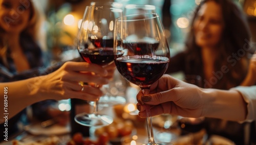 friends, toasting, wine, goggles, dinner, celebration, red, clinking, table, people, gathering, cheer, party, social, event, enjoyment, dining, eatery, festive, group, happiness, leisure, lifestyle, meal, night, togetherness, wine glass, alcohol, banquet, cookery, drinking, evening, food, indoor, joy, toast
