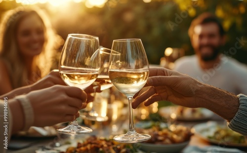 Friends Toasting with White Wine at an Outdoor Table During Golden Hour