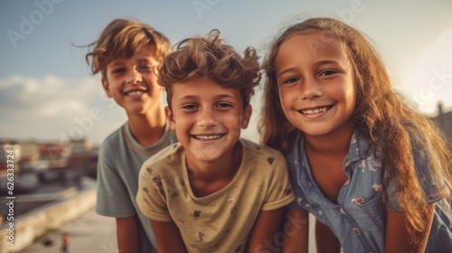 Friendship Day. Children's friendship. Happy children smiling at the camera. Generative AI