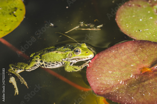 Frog. A frog in water near water lily leaves. Frog in the nature