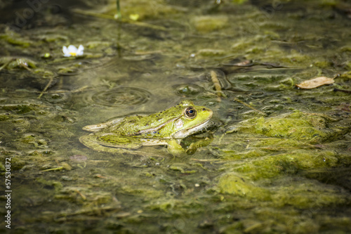frog with tiny flies on her head in a river