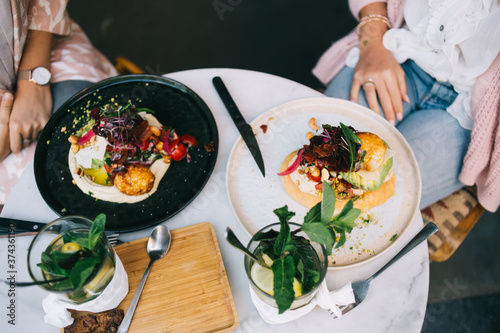 From above picture of healthy delicious dish in restaurant menu with organic ingredients and spices, top view of modern cuisine with colorful veggie meal vegetables and tomatoes