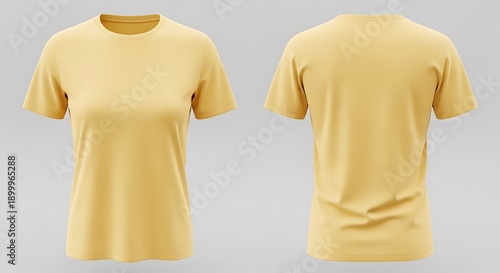 t-shirt, yellow, shirt, clothing, apparel, garment, blank, plain, template, front, back, view, fashion, casual attire, cotton, fabric, textile, wear, design, empty, simple, short, sleeve, unisex, male, female, top, tee, product, display, studio, isolated, background, grey, light, soft