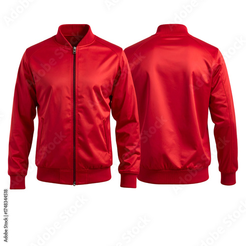 red, jacket, bomber, satin, front, back, view, clothing, apparel, fashion, style, design, textile, fabric, smooth, shiny, glossy, texture, isolated, blank, empty, template, wearable, garment, crimson, scarlet, ruby, high-coloured, bright, formal, casual attire, modern, unisex, zip, collar, ribbed, cuff, elastic, sleeve, shoulder, fit, shape, comfortable, lightweight, everyday, outerwear, activewear