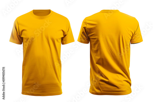 Front and back view of blank yellow T-shirt mockup on plain white background