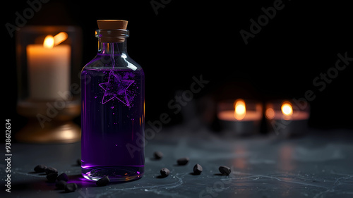 front angle product shot of a magical purple drink potion, simple magic background