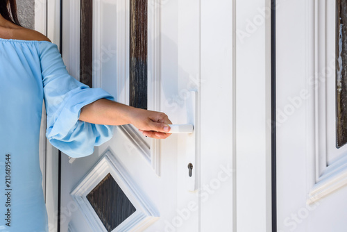 door, woman, open, home, front door, white, front, outside, glasses, plastic, pvc, knob, security, style, door handle, doorway, entrance, detail, close, closeup, exit, frame, house, handle, hand, opening, person