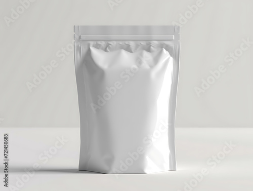 Front view of a blank 3d food packaging mockup. Suitable for food product promotion design, and sales promotion of packaging products. White-colored room background. Created with Generative AI.