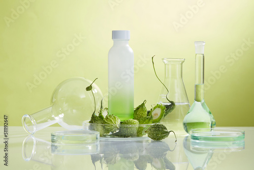 Front view of bitter melon with cosmetic jar decorated with laboratory equipment in green background
