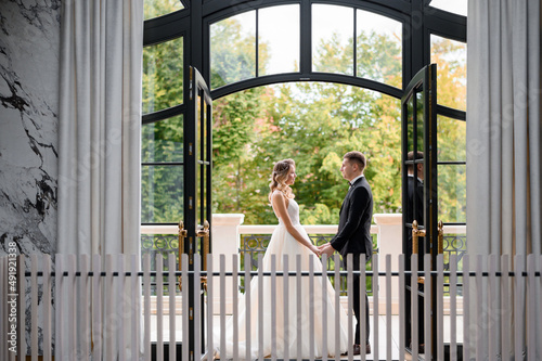 Front view of large wooden and opened window, which placed on centre of marble wall in luxury building and couple standing outside, which holding hands and looking to each other