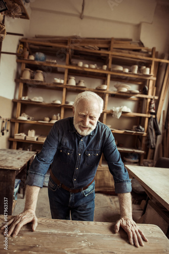 Front view of senior potter standing and leaning on table against shelves with pottery goods at workshop