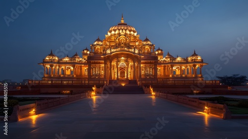 Front view of the Akshardham Temple in Delhi, glowing brightly under illuminated lights at night, in 4K resolution