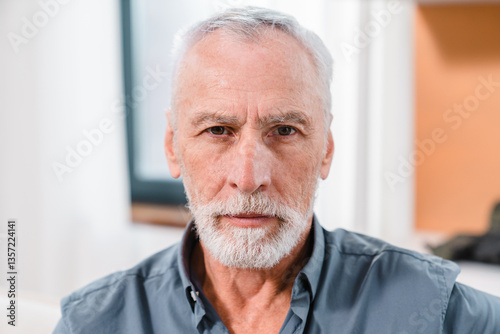 Front view portrait of a confident thoughtful pensive Caucasian middle-aged mature senior serious man looking at camera at home interior. People emotions healthy medicine concept