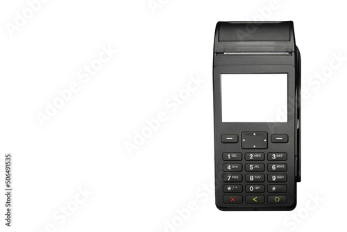 front view, swipe machine, white screen and black plastic on white background, object, technology, business, market, copy space