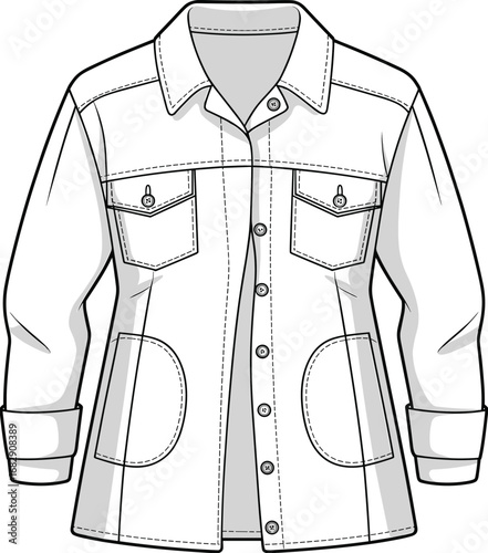 Front view women's denim jacket fashion flat sketch, pocket detail, button-up style, cad drawing, vector fashion garment illustration