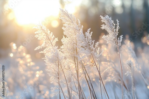 Frost-covered tall grass illuminated by soft golden sunlight in a serene winter landscape