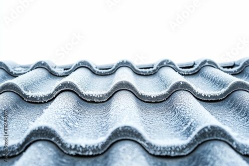 Frost-covered wavy roof tiles, winter scene.