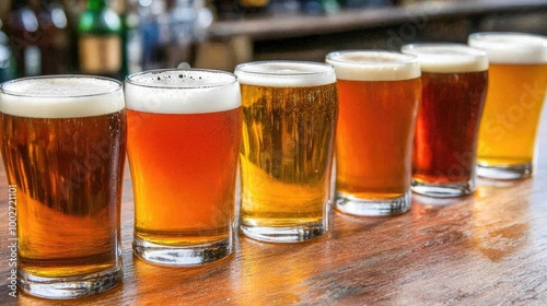 beer, frosty, goggles, amber, liquid, row, colours, refreshment, brewery, craft, cold, beverage, foam, bar, alcohol, pub, drink, party, celebration, toast, tempt, thirst, enjoyment, sunlit, wooden, table, taste, bubble, pour, rich, smooth, crisp, gold, refreshing, summer, traditional, variety, showcase, serving, chilled, friends, social, leisure, fun, atmosphere, casual attire