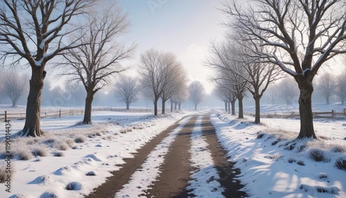 Frosty countryside scene with snow-covered path and bare trees, snowscape, cold, frigid, frost