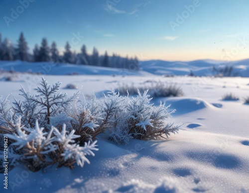 Frosty landscape with delicate snowflakes against blue winter sky, winter scene, icy landscape, wintery scene