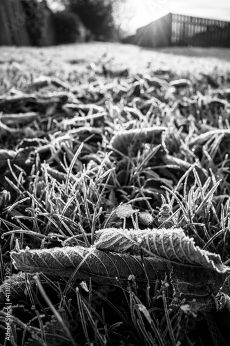 frost, black-and-white, closeup, environment, grass, hoar frost, ice, leaf, leaf, low angle, morning, nature, park, scenic