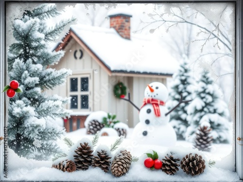 Frosty windowpane on a small cottage with a snowman standing outside surrounded by pinecones and holly, winter, snowy