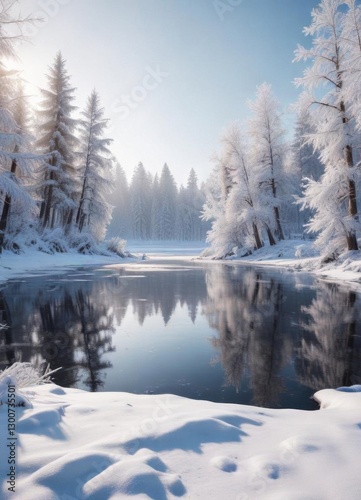 Frosty winter scene with snow-covered trees and a frozen lake, serene, frosty, winter