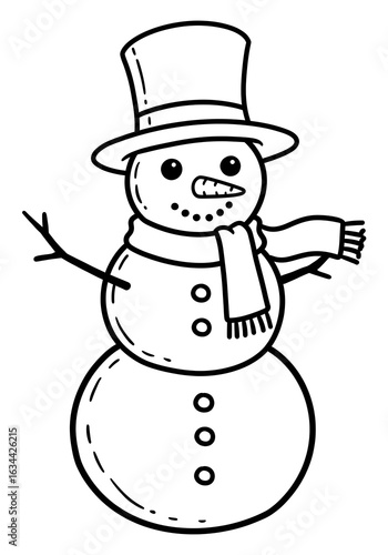 snowman, snow, holiday, cute, cartoon, drawing, illustration, line art, black-and-white, simple, happy, festive, cheerful, friendly, jolly, adorable, fun, seasonal, character, silk hat, foulard, buttons