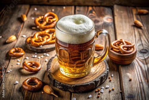 Frothy golden lager overflowing from a sturdy, rustic ceramic mug adorned with intricate designs, resting on a