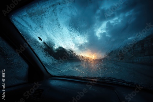 Frozen car windshield limits visibility and causes danger on the road