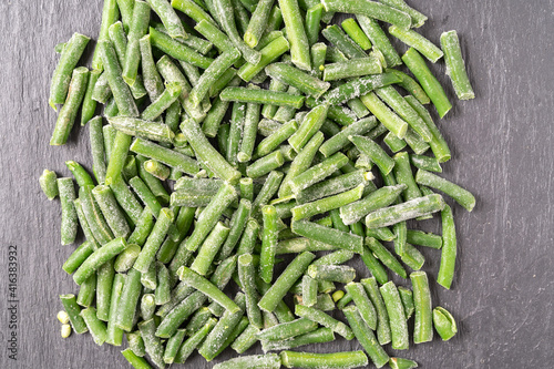 Frozen green string beans on black background.