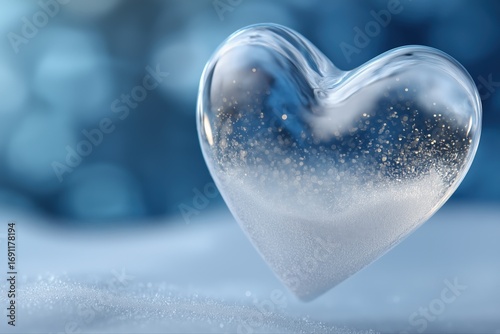 Frozen heart shaped ice sculpture with snowflakes on blue bokeh background