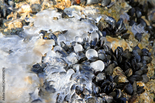 shanghai, mussel, shell, black, biological, ecological, ice, rock, sea, winter, cold, nature, environment, closeup