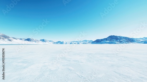 Frozen Lake Landscape with Snow Covered Mountains and Clear Blue Sky