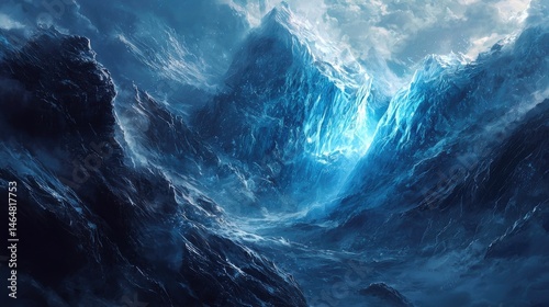 icy, mountain, vale, peak, glacé, blue, light, cold, landscape, snow, dramatic, nature, winter, huge, high, altitude, grandeur, rocky, textured, frost, glacial, illuminated, illumination, dark, sky, cloud, storm, wind, whimsical, artistic, digital, fantasy, adventure, exploration, powerful, environment, exterior, scene, view, viewpoint, detail