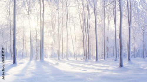 Frozen Serenity - Ultra-Detailed Image of Tranquil Winter Morning in Ice Age Forest with Sunlight Filtering Through Trees and Illuminating Snow